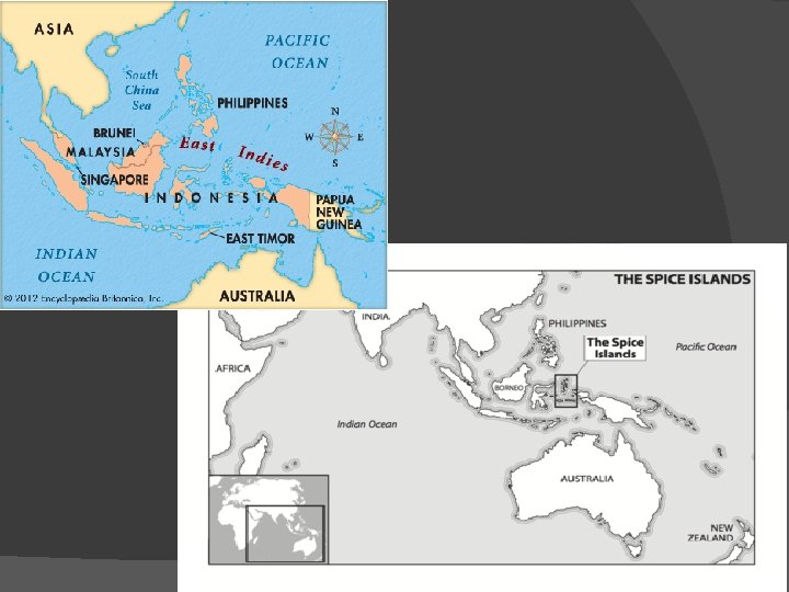 WHY ARE SPICES IMPORTANT? � Europeans want spices preserve & improve food, make medicine, cosmetics & perfumes � “SPICE ISLANDS” – East Indies (present day Indonesia, Malaysia & New Guinea), & India