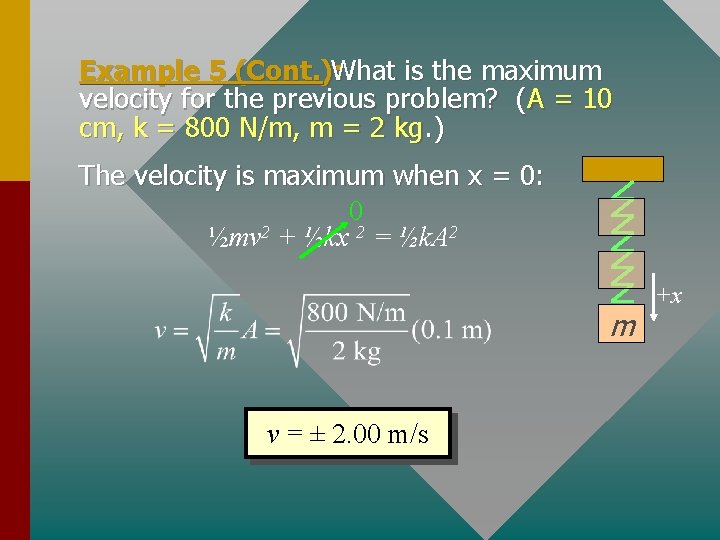 Example 5 (Cont. ): What is the maximum velocity for the previous problem? (A = 10 cm, k = 800 N/m, m = 2 kg. ) The velocity is maximum when x = 0: 0 ½mv 2 + ½kx 2 = ½k. A 2 m v = ± 2. 00 m/s +x