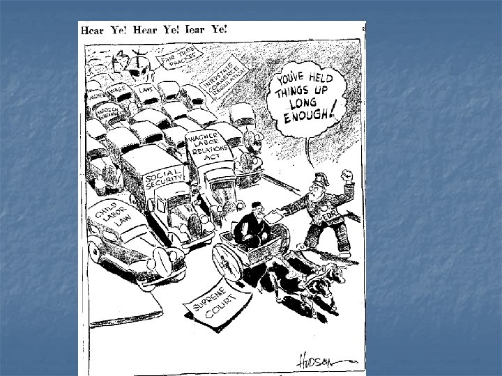 The Court in 1937 n n n Older Generation Had different vision of society 9 Judges- 7 appointed by Republicans n n n 80% of Judges in lower Fed courts Roosevelt was Frustrated: FDR proposed to add up to six new judges to the Supreme Court and up to 44 judges to lower federal tribunals. His scheme was advertised as court reform.