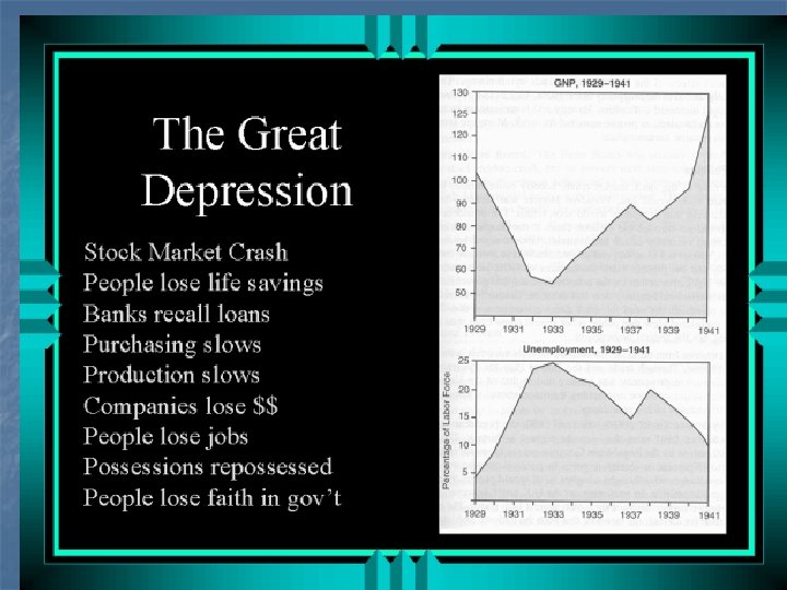 Causes of the Depression n Uneven Distribution of income Stock Market Speculation. Excessive Credit n n Buying Stock on Margin Over Produciton of Farm Goods