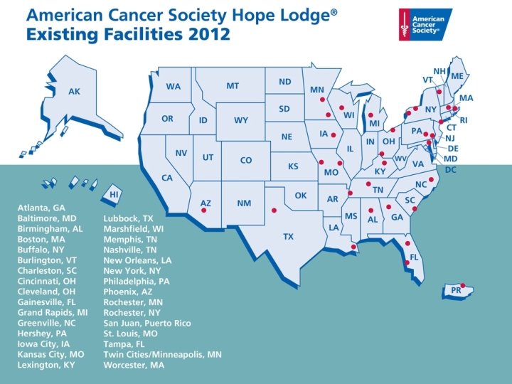 What is Hope Lodge? • A free American Cancer Society program for cancer patients and their caregivers • Home-like environment with private rooms • Provides free overnight lodging for cancer patients and their caregivers while in town for treatment • Equipped with kitchen and dining facility, laundry room, and library • Offers encouragement and support from others who are going through treatment.