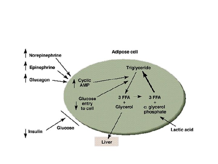 Catecholamines (adrenergic) During Exercise • Break down glycogen in liver to free glucose available • Break down triglycerides in the adipose tissue to make FFA available • Block entry of glucose into the cell
