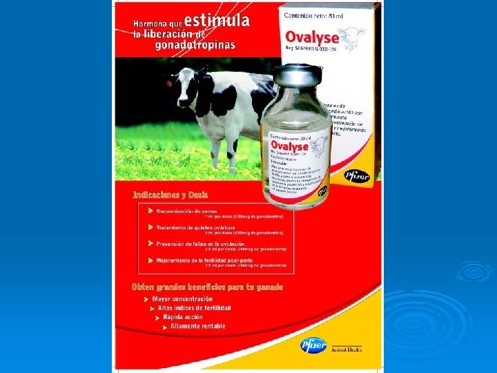 MEJORAMIENTO DE LA FERTILIDAD POST PARTO Ø El tratamiento con Ovalyse en los primeros 40 dias post parto puede iniciar la reanulación de la ciclicidad en las vacas acíclicas y reducir la incidencia de desórdenes ováricos postparto y por lo tanto minimizar el intervalo partoconcepción o “días abiertos”. Ø Dosis: 2. 5 ml