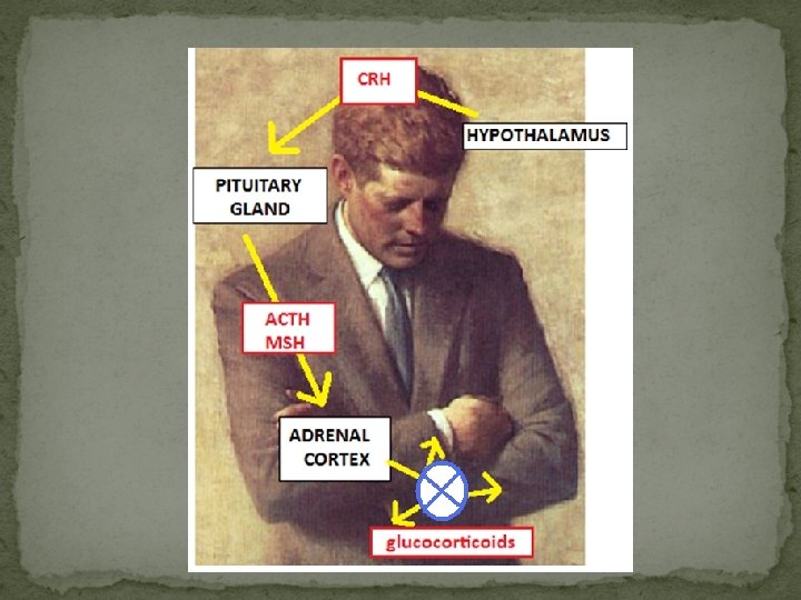 Adrenal Insufficiency �Addison’s disease--hyposecretion of cortisol �JFK �Darkened skin (ACTH mimics MSH) �Weight loss, hypoglycemia �Find the anomaly in the feedback loop. �Inability to handle stress