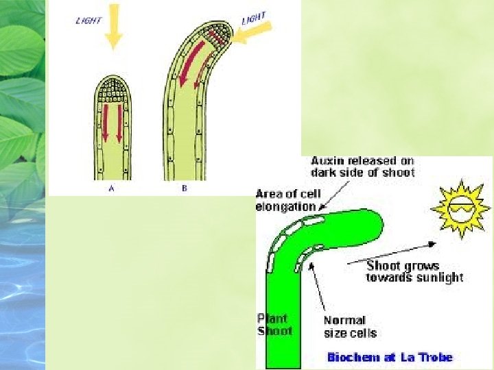 PLANT SHOOTS • Shoots grow UP (negatively geotropic) • Shoots grow towards light (positively phototropic) • So that they can absorb light for photosynthesis
