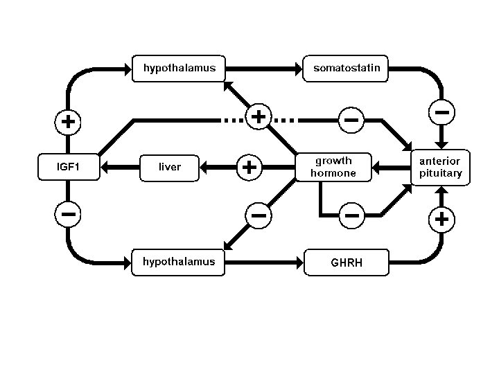 Control of secretion of growth hormone • Controlled by hypothalamus – Increases secretion by pituitary gland • Releases growth hormonereleasing hormone (GHRH) – Decrease growth hormone secretion • Releases somatostatin • Factors that can affect secretion of growth hormone: – Stress, exercise, nutrition, sleep, amount of growth hormone – Because ghrelin is secreted by stomach when body is in stress. It binds to pituitary and hypothalamus and increases growth hormone. Relationship not fully understood