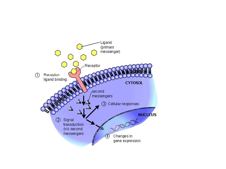 Transferring the message through the cell – direct to nucleus method • Steriod hormones enter the cytoplasm directly through cell membrane and may move into the nucleus. • Here they will interact with a specific protein receptor molecule, which if not in the nucleus will move in as a hormone-receptor protein complex • Here it interacts with the DNA and adjusts the cells function by turning on or off genes.