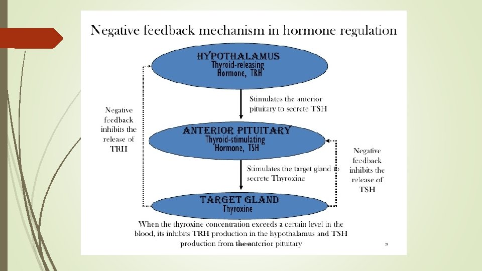 Hormone regulation Hormone levels need to be regulated within certain levels. This is usually achieved with negative feedback mechanisim. Much like a thermostat found in typical households, aiming to maintain room temperature by monitoring surrounding environment with sensors. To cold = boiler turns on till set temperature is reached then shuts off Hypothylimus/pituritary complex is thermostat, hormone level in the blood is equivalent to air temperature Hormone level drop = endocrine gland “turns on” hormones are released to reach desired level then “shuts off”