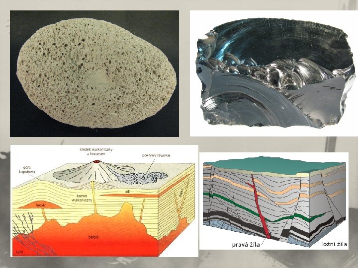 Hlubinné a výlevné vyvřeliny n Hlubinné (…………. ) vyvřeliny, výlevné (…………. ) vyvřeliny (…………. ), žilné vyvřeliny n Pemza – porézní výlevná vyvřelina, ryolitového složení n Vulkanické sklo – …………. n Typy intruzivních vyvřelých těles (plutony): batolit, lakolit, peň, pravá žíla, ložní žíla, sopouch, odžilky.