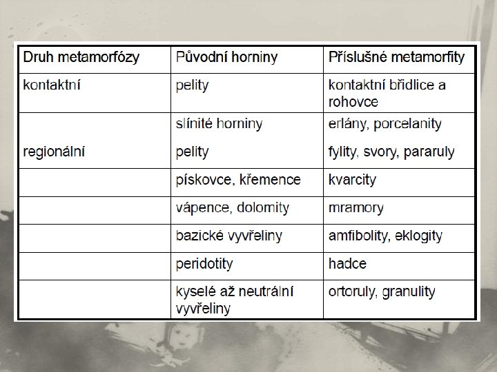 Metamorfované horniny n Metamorfóza = …………………. . n Izofázová metamorfóza – minerály v původní hornině se chemicky nemění a dochází pouze k jejich překrystalování; alofázová metamorfóza – dochází k tvorbě nových minerálů n Kontaktní metamorfóza – nastává na styku starších hornin s tuhnoucím magmatem jak ve větší hloubce, tak na zemském povrchu; faktory metamorfózy: teplota a tlak n Regionální metamorfóza – postihuje různorodé komplexy hornin na velkých územích; faktory metamorfózy – teplota, tlak, chemická aktivita plynů, par a roztoků