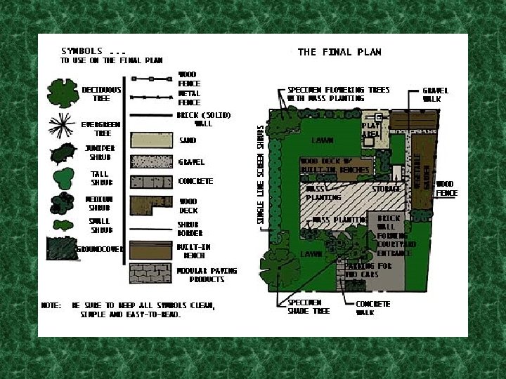 How can students take the information shown in a landscape plan and implement it into the construction of the design? • II. Reading a landscape plan is like reading a map. It shows you where you need to place individual plants as well as indicating where paths, patios, and water features will go. • But reading the plan is only part of the picture. Application to real life settings is essential.
