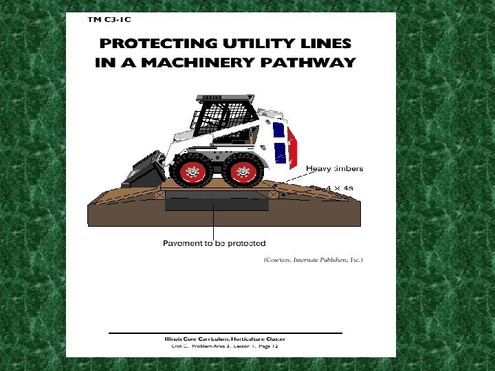 How can existing site features be protected from damage in the installation process? • C. Protecting utilities should also be considered when developing a landscape plan. Utilities include water, electric, sewer, and phone lines. – These should be staked out or otherwise marked, preferably by the utility companies themselves. If a machinery pathway must cross a utility line, care should be taken to protect it.