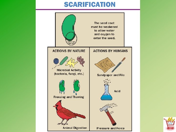 What is germination and what conditions are necessary for germination to occur in a seed? • Scarification is a mechanism that prevents germination until the seed coat has been physically broken down. • A tough, protective seed coat prevents diffusion of both water and oxygen into the seed. • The seed coat must be broken before germination can begin.