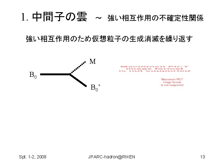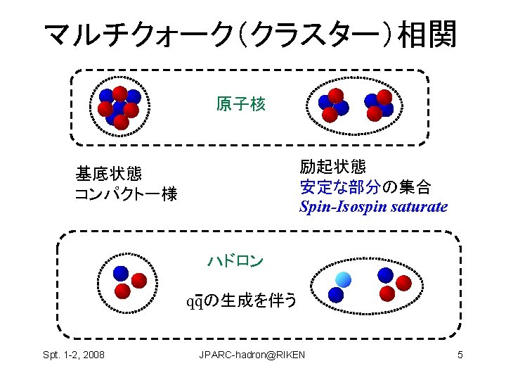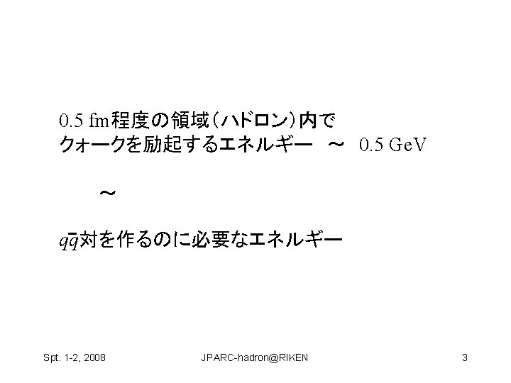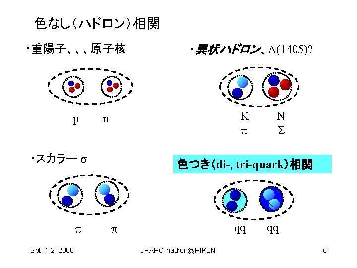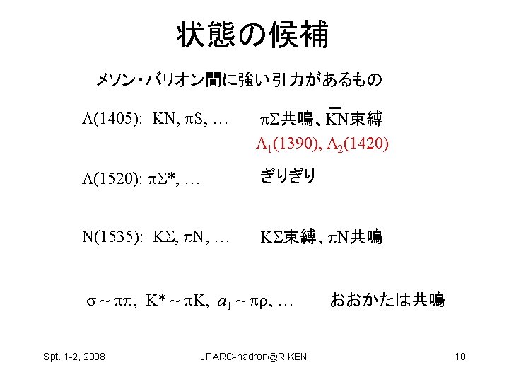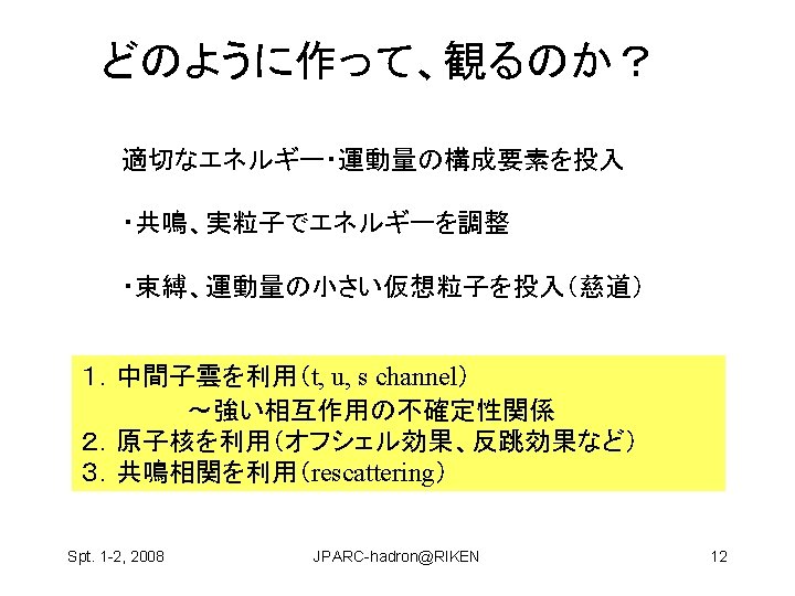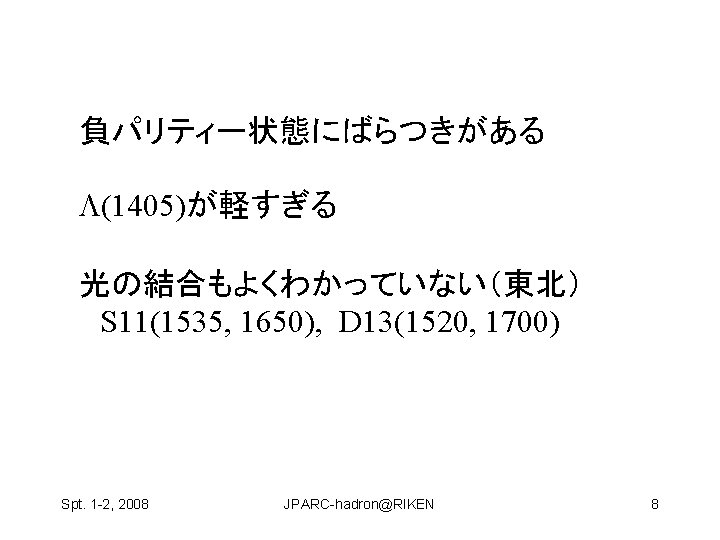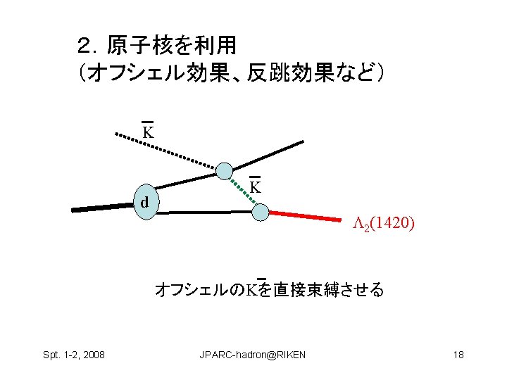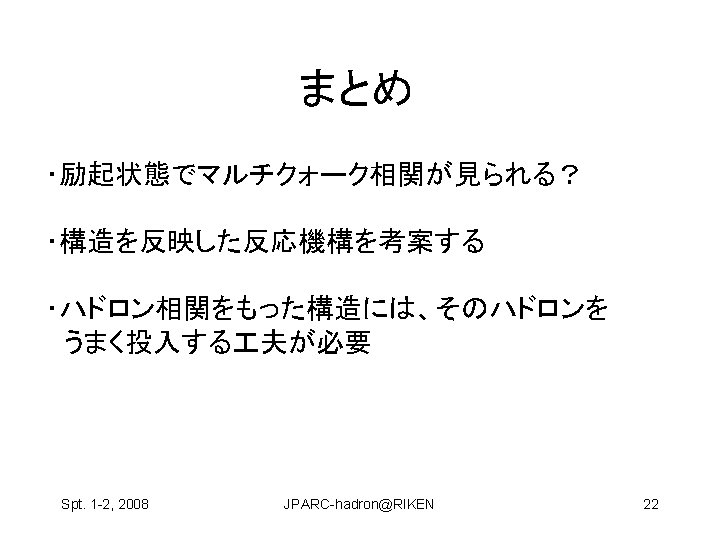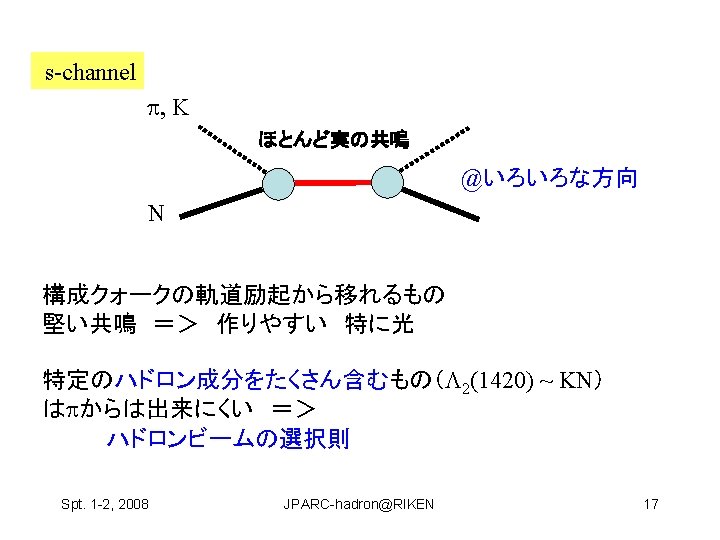 Hosaka Atsushi RCNP Osaka Univ Spt 1 2 Slides: 22 Download presentation ハドロン物理 保坂 淳 Hosaka, Atsushi, RCNP Osaka Univ Spt. 1 -2, 2008 JPARC-hadron@RIKEN 1 構成クォーク模型が機能している? qq and qqq 基底状態 minimal 励起状態は? • クォーク励起 (single particle levels) • Minimal + qq Spt. 1 -2, 2008 JPARC-hadron@RIKEN 2 構成クォーク模型が機能している? qq and qqq 基底状態 minimal 励起状態は? • クォーク励起 (single particle levels) • Minimal + qq • マルチクォーク genuine nonminimal, tetra, penta, … Spt. 1 -2, 2008 JPARC-hadron@RIKEN 4 Negative parity baryons Spt. 1 -2, 2008 JPARC-hadron@RIKEN 7 P-wave Ge. V N(1710) Open channels K S-wave N(1650) K N(1535) 1. 5 N(1440) N (1520) (1405) KN (1232) N 1 N(940) Spt. 1 -2, 2008 JPARC-hadron@RIKEN 9 どのように作って、観るのか? mi mf N B Spt. 1 -2, 2008 JPARC-hadron@RIKEN 11 3.共鳴相関を利用 K K p Spt. 1 -2, 2008 K* 中野機構 K JPARC-hadron@RIKEN 1(1390) 19 3.共鳴相関を利用 K K p 1(1390) cos Spt. 1 -2, 2008 K K* 中野機構 EK [Ge. V] JPARC-hadron@RIKEN E [Ge. V] 20 の場合 K P n Spt. 1 -2, 2008 � (1520) JPARC-hadron@RIKEN E [Ge. V] 21