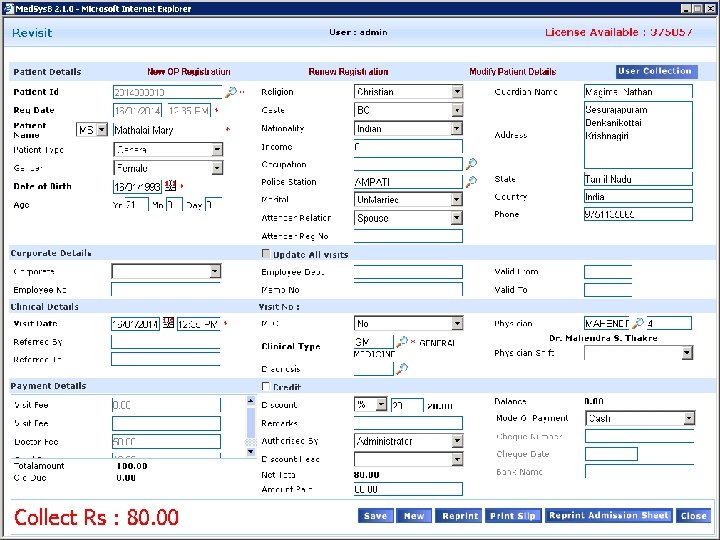 Out Patient Registration with Unique Registration Number Renewal Features Cancellation Doctors Share Maintenance Patient, Doctors &clinical Department based Fee