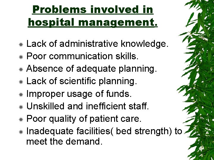 Problems involved in hospital management. Lack of administrative knowledge. Poor communication skills. Absence of adequate planning. Lack of scientific planning. Improper usage of funds. Unskilled and inefficient staff. Poor quality of patient care. Inadequate facilities( bed strength) to meet the demand.
