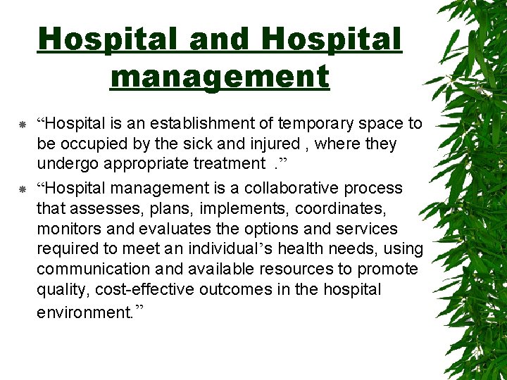 Hospital and Hospital management “Hospital is an establishment of temporary space to be occupied by the sick and injured , where they undergo appropriate treatment. ” “Hospital management is a collaborative process that assesses, plans, implements, coordinates, monitors and evaluates the options and services required to meet an individual’s health needs, using communication and available resources to promote quality, cost-effective outcomes in the hospital environment. ”