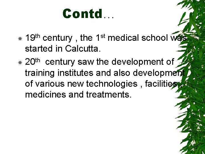 Contd… 19 th century , the 1 st medical school was started in Calcutta. 20 th century saw the development of training institutes and also development of various new technologies , facilities , medicines and treatments.