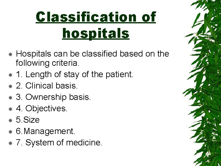 Classification of hospitals Hospitals can be classified based on the following criteria. 1. Length of stay of the patient. 2. Clinical basis. 3. Ownership basis. 4. Objectives. 5. Size 6. Management. 7. System of medicine.