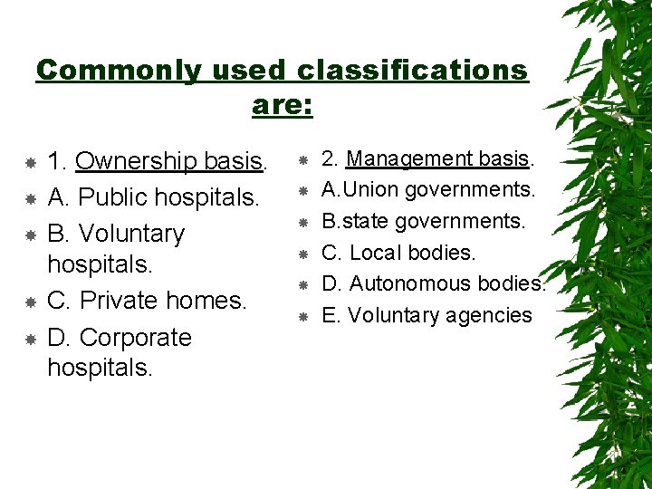 Commonly used classifications are: 1. Ownership basis. A. Public hospitals. B. Voluntary hospitals. C. Private homes. D. Corporate hospitals. 2. Management basis. A. Union governments. B. state governments. C. Local bodies. D. Autonomous bodies. E. Voluntary agencies
