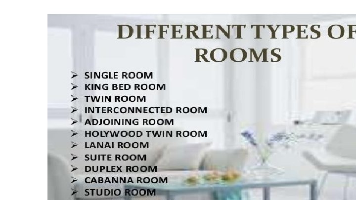 Types of Suites can include: • Master Suite: A parlour or living room connected to one bedrooms. • Mini-Suite or Junior Suite: A single room with a bed and Sometimes the sleeping area is in a bedroom separate parlour or living room. Other types of rooms can include: • Connecting rooms: Rooms with individual entrance d outside and a connecting door between. Guests can rooms without going through the hallway. • Adjoining rooms: Rooms with a common wall, but no co