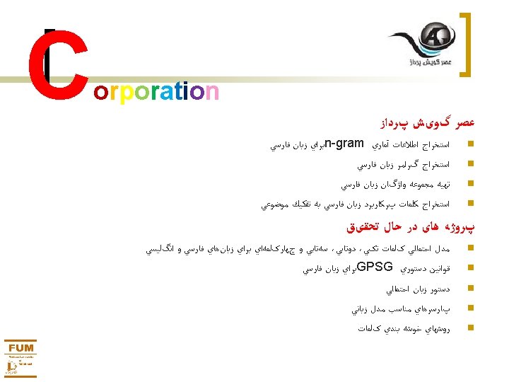 Natural Language and Text Processing Group Research Project: Project Title More Than 23 Papers ? English-Persian Statistical Machine Translation English-Persian Rule-based Machine Translation Statistical Word Sense Disambiguation Automatic Persian Word. Net Construction Parallel and Comparable Corpus Construction Monolingual Corpus Construction Spell, Grammatical and Real-word Error Detection and Correction Grammar Induction Semantic Role Labeling Statistical Parsing Text Classification using Neural Networks