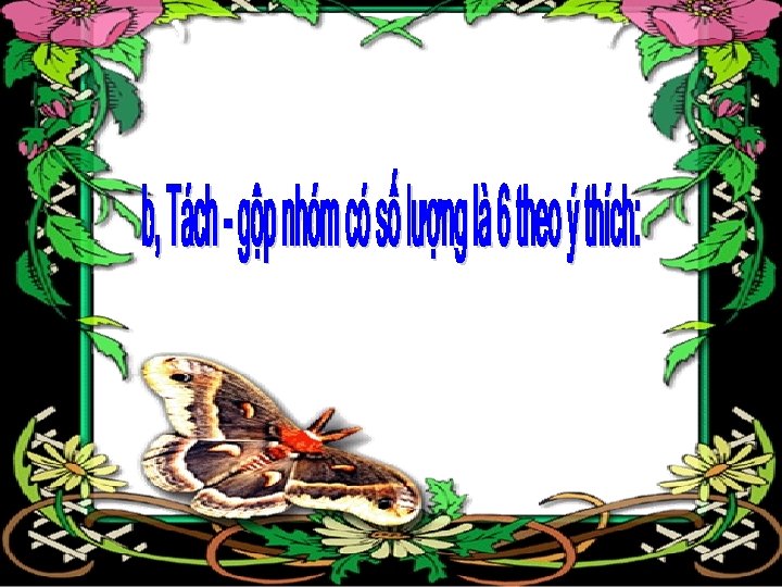 * Tách theo ý thích: Cô cho trẻ tách 6 bông hoa thành 2 phần theo cách trẻ thích và đặt thẻ số tương ứng cho mỗi phần. - - Cô cho trẻ nêu cách tách của mình và cô biểu thị cách tách của trẻ trên màn hình cho các trẻ khác dễ quan sát.