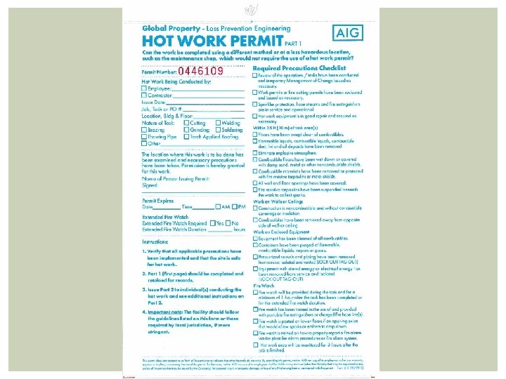 PERMIT PROCESS – RECORD KEEPING Permits available in Work Order Center or Safety Offices One completed copy must remain on jobsite One completed copy is retained at FM Duration: § § 12 hour periods for spot work 72 hour maximum for large ongoing jobs Duration of construction on sites with restricted public access Areas must be routinely inspected and remain fire safe at all times