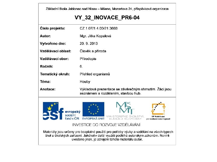 ZDROJE učebnice: ČABRADOVÁ, Věra. Přírodopis pro 6. ročník základní školy a primu víceletého gymnázia. 1. vyd. Plzeň: Fraus, 2003, 120 s. ISBN 80 -723 -8211 -X.