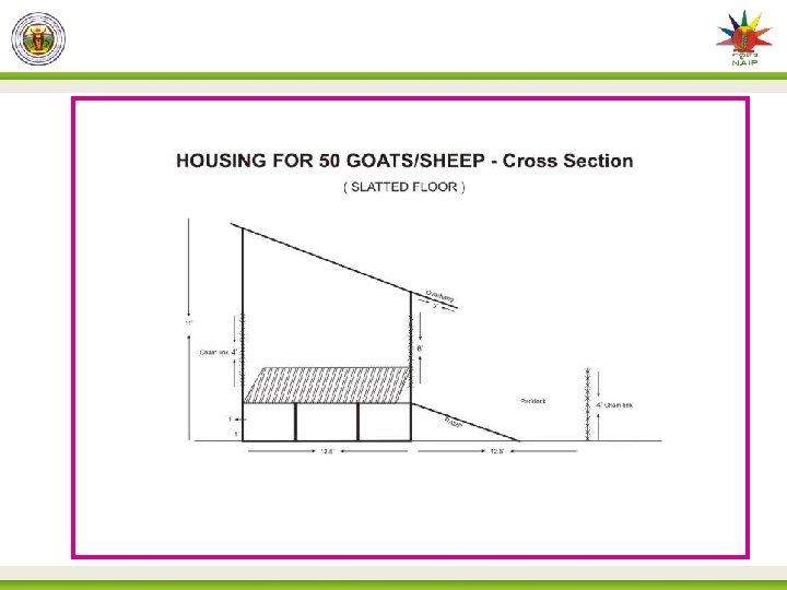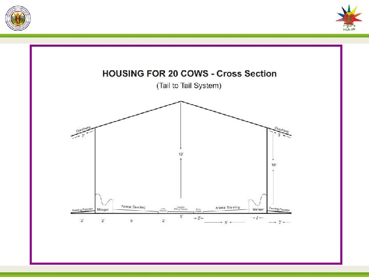 Floor space requirement Type of animal Floor space requirement (m 2) Covered area Open area Maximum Height of the number of shed (cm) animals/pen Cattle and Buffaloes Bulls 12. 0 24. 0 1 Cows 3. 5 7. 0 50 Buffaloes 4. 0 8. 0 50 Down – calver 12. 0 1 Young – calves 1. 0 2. 0 30 Old – calves 2. 0 4. 0 30 175 cm in medium and heavy rain fall and 220 in dry areas.