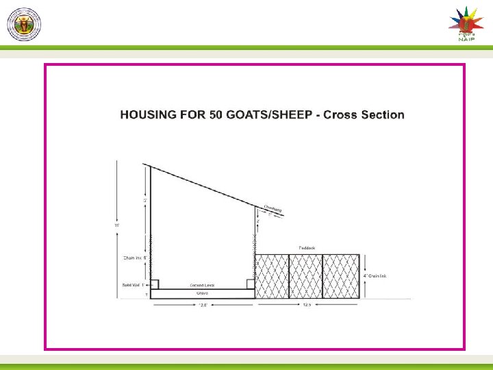 Cont… Sheep and Goat Ewe/Nanny 1. 0 - 60 Lamb/kid 0. 4 - 75 Ram/buck 3. 4 - - Milch doe 1. 4 mx 1. 2 m - Single stall 6. 0 – 7. 0 8. 8 – 12. 0 - 7. 0 -9. 0 8. 8 – 12. 0 - Weaner/fatte ning pig 0. 9 – 1. 8 30 Dry sow/gilt 1. 8 – 2. 7 1. 4 – 1. 8 3 – 10 300 – dry areas and 220 in heavy rain fall areas Pigs Boar Farrowing sow 200 – 250 cm