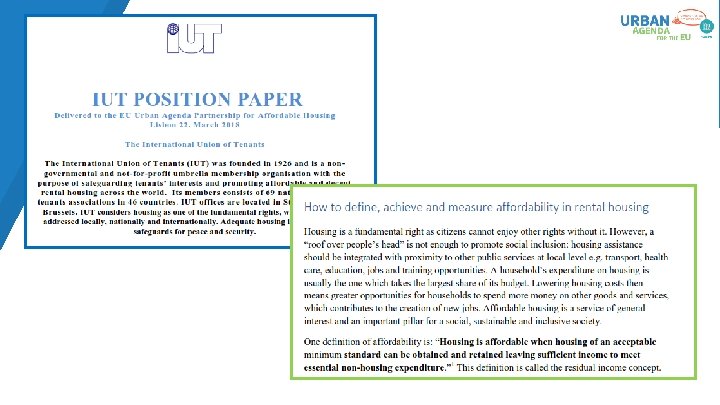 Good Policy and Practice Policy recommendations on 8 priority themes: • protection of vulnerable groups • anti-speculation • renovation and energy efficiency • co-ownership, co-management and co-design • spatial planning • rent stabilisation and control • land use and building ground • security of tenancy