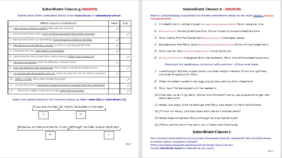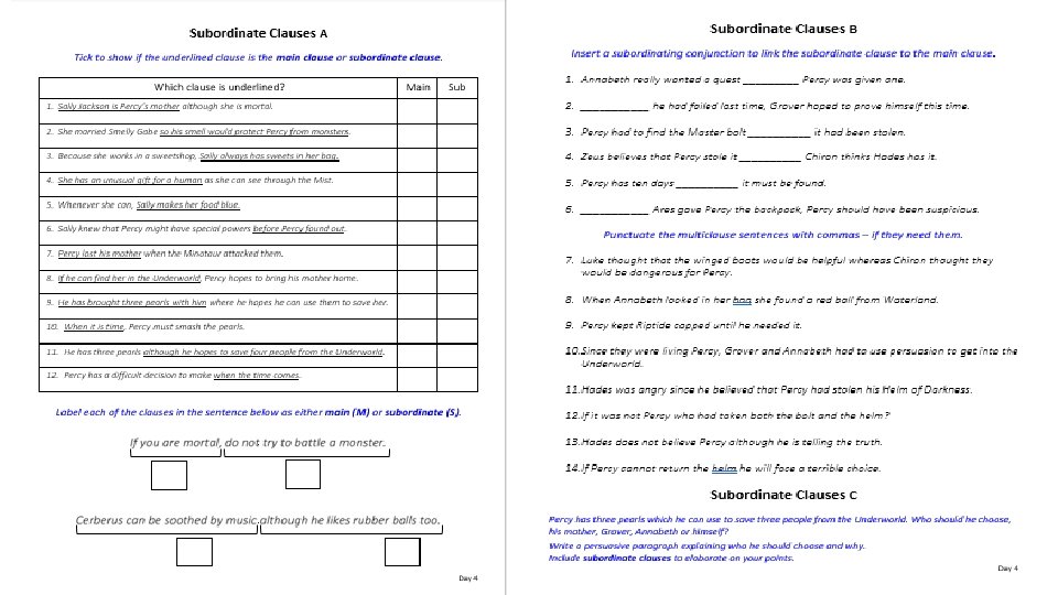 Subordinate Clauses because he was not a demigod when he fell over Subordinate clauses expand on the main clause but cannot stand alone. as he had ripped his trousers where he was the centre of attention Grover felt embarrassed A sentence can be made up of several main and subordinate clauses.