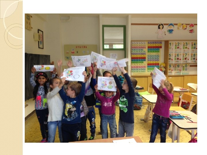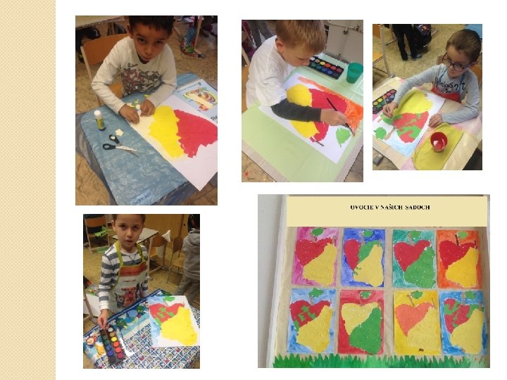 5. Lepenie jablka a hrušky �Žiaci sa po mnohých aktivitách nachvíľu sústredili len na lepenie malých kúskov farebného papiera, prostredníctvom ktorých vytvorili jablko a hrušku. Práce sa im naozaj podarili a mali z nich obrovskú radosť.