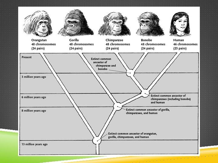 EVOLUTION OF LANGUAGE Human and non-human primate line split 10 -13 million years ago (mya) Chimpanzees and humans split 5 million years ago During human evolution, we began walking bipedally (on two legs) millions of years before we had big brains or language Language did not evolve until about 2 mya