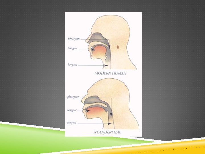 EVOLUTION OF LANGUAGE Human ancestors, the Neanderthals, had language very similar to our own They had huge brains (1700 cc compared to human’s 1400 cc) The position of their hyoid bone (where voice box is) is in same place as in humans