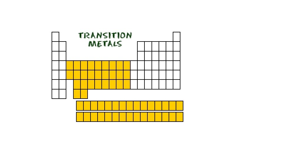 Transition Metals • Shiny • High melting and boiling points • High Densities • Good Conductors of Heath and electricity • Gold, silver, platinum • Used for coins, electric and heat applications, structural materials.