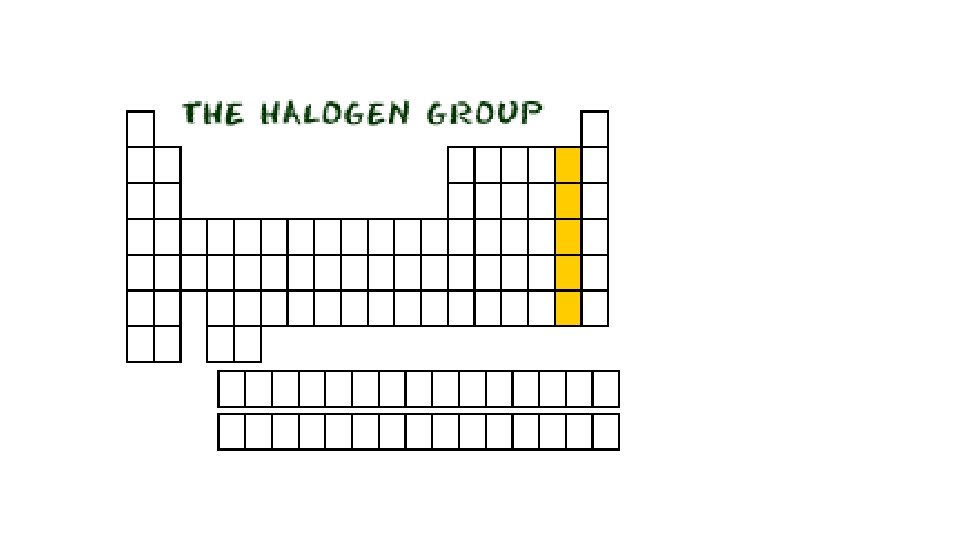 Halogens • Group 17 • 7 electrons in their outer shell • All VERY reactive non-metals (Therefore not found freely in nature) • typically found in minerals or salts • All toxic in their elemental form. • At room temperature, some are liquid (bromine) some gas (fluorine and chlorine), some solid (iodine). • All halogens have bright colors as gases: chlorine is yellow, bromine is orange, and iodine is purple
