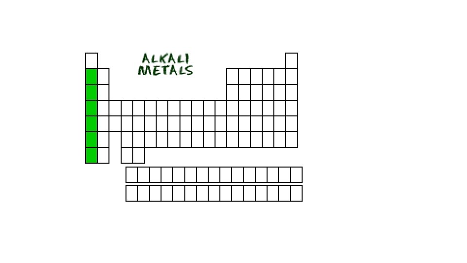 Alkali Metals • First column (Group 1) of Periodic Table • (but does not include Hydrogen) • shiny, soft, low densities. • Malleable, some soft enough can be cut with a knife, • Not found freely in nature because they all react vigorously with oxygen and water.