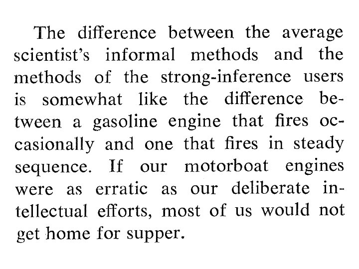The Rules of Strong Inference: 1. Devise multiple hypotheses. 2. Design experiment(s) to eliminate one or more of the hypotheses. 3. Carry out the experiments in a manner that gives a clean result.