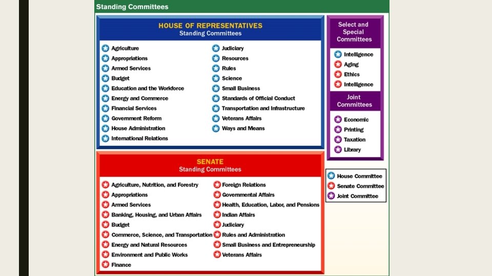 Committees (cont. ) • Both houses also have select committees that are created to do a special job for a limited period. • They disband after completing their task. • Joint committees include members of both houses. • Temporary conference committees help the House and Senate agree on the details of a proposed law.