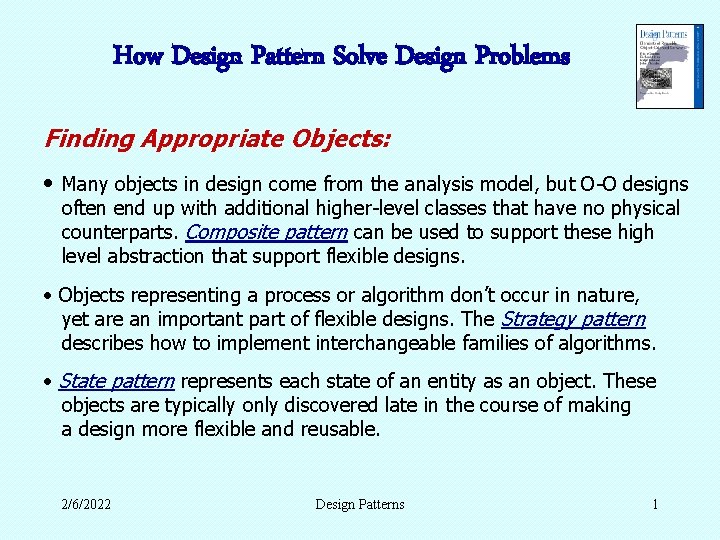 How Design Pattern Solve Design Problems Finding Appropriate Objects: • Many objects in design come from the analysis model, but O-O designs often end up with additional higher-level classes that have no physical counterparts. Composite pattern can be used to support these high level abstraction that support flexible designs. • Objects representing a process or algorithm don’t occur in nature, yet are an important part of flexible designs. The Strategy pattern describes how to implement interchangeable families of algorithms. • State pattern represents each state of an entity as an object. These objects are typically only discovered late in the course of making a design more flexible and reusable. 2/6/2022 Design Patterns 1
