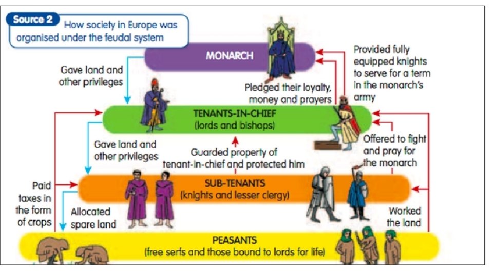 1. King had more control over everyone, as all land was his and his followers simply leased it from him (e. g. introduction of ‘tenant’) 2. It is less flexible i. e. peasants will always stay peasants, knights cannot become barons and barons cannot challenge the king. This helps William keep control of England. 3. It is more militaristic as it allows the king to raise an army quickly and for free (knights owed 40 days unpaid, barons had to raise an army in return for holding the king’s land) 4. Earls and thegns have been replaced by tenants-in-chief and subtenants. 5. All the land more controlled by the king than previously. Everyone pays tax, but people have to pay a relief to inherit land. Saxons had to pay money to continue to use their land after the conquest. 6. Slavery has been abolished, but peasants are much like slaves as they are forced to work for their masters for life.