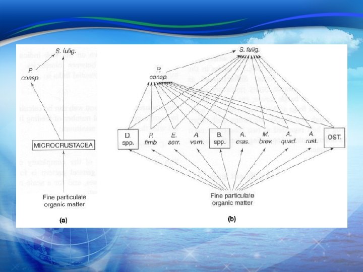 How do Humans Impact Aquatic Systems 5. Key ecological concepts (cont. ) c. Representing the community (cont. ) n Food chains and food webs q q q The simple representation of the steps and transformations that organic material goes through from primary producer via intermediate consumers to final consumer Basal species: primary producer or consumer of detritus The number of tropic levels The efficiency of transfer of energy across the levels Trophic species (biospecies): § § Combinations of species assumed to have similar niches Functionally equivalent groups of true species which are assumed go feed on the same range or prey and in turn are preyed on by the same suite of predators: functionally equivalent