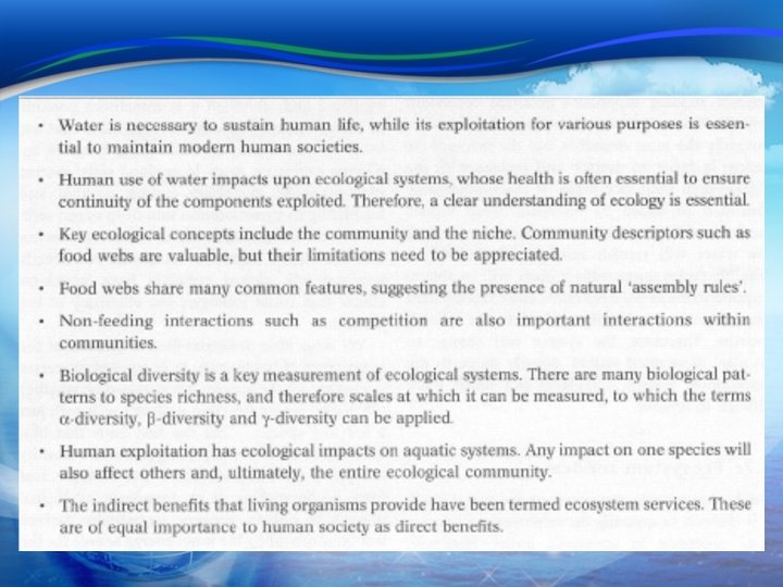 How do Humans Impact Aquatic Systems 4. The need for understanding (cont. ) d. Altering species’ abundance and distribution n n Direct harvesting – reduced; enhanced(? ) Indirect alteration ①pollution ②habitat loss ③excessive removal of key species and a host n Introduction q ①Deliberate translocation and ②accidental introduction q Exotic species (Box 1. 1 mosquito fish) e. Interactions n Sea level change (rise) q Coastal habitat § Flood defense management n n n Climate change – rainfall pattern Interconnected Ecological interactions – basic ecological principles