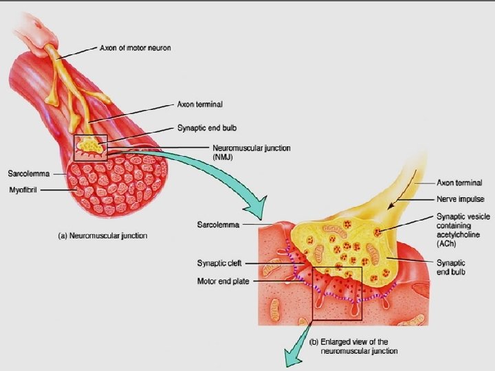 PARTS OF A MOTOR NEURON Neuromusc. Junction – area where the neuron meets the muscle. synaptic cleft – small space b/w the two structures terminal bouton- distal end of the neuron, which contains – Synaptic vesicles – small “bubble-like” packets that contain ACh (Acetylcholine) ACh – is a neurotransmitter (chemical that carries a signal from a neuron to a muscle cell or to another neuron)