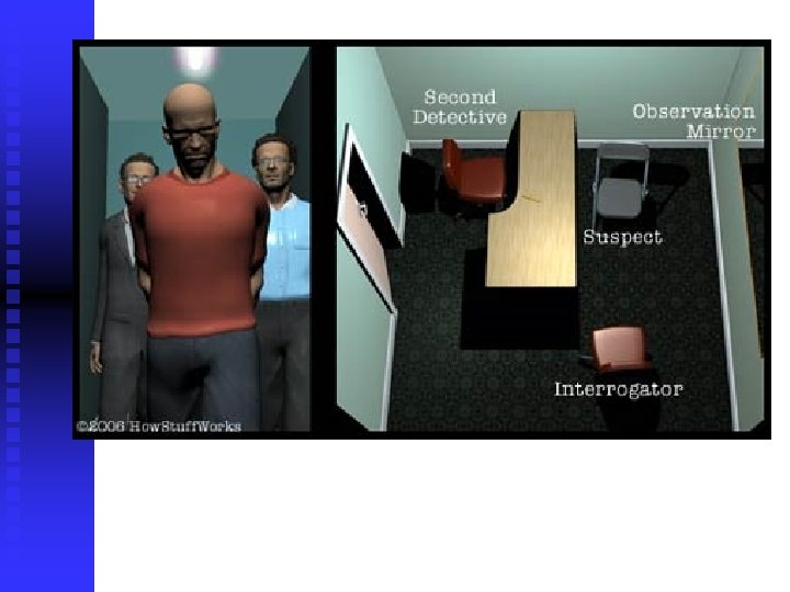 Common Interrogation Techniques The manual also suggests that the suspect should be seated in an uncomfortable chair, out of reach of any controls like light switches or thermostats, furthering his discomfort and setting up a feeling of dependence. A one-way mirror is an ideal addition to the room, because it increases the suspect's anxiety and allows other detectives to watch the process and help the interrogator figure out which techniques are working and which aren't.
