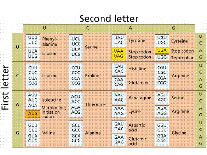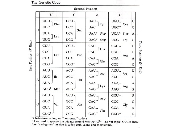 How many bases are required to make a genetic code to serve 20 different amino acids? # of 2 -base combos = 42 = 16 Not enough! # of 3 -base combos = 43 = 64 Too many! What is the solution? How? Evolve a code that is redundant! Degeneracy at the third codon position Let’s look at the Genetic Code