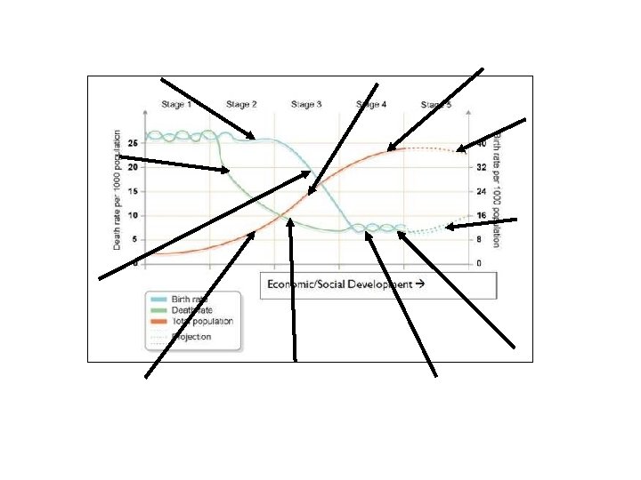 Many children help with farm work Rapid population growth Population growth stabilizes Population Declines Basic healthcare is improving but is still poor in rural areas An ageing population so death rate of old people increases People work in factories in cities so need less children Population begins to growth Water, sanitation and healthcare services improve throughout the whole country Women have careers and have fewer children Excellent healthcare and high standard of living