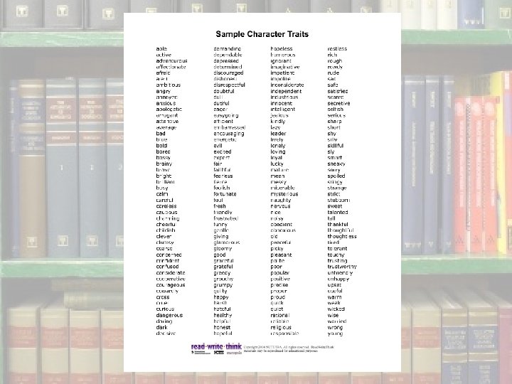 What are character traits? • Character traits are adjectives used to describe a character in a text. • Understanding the traits of a character can go a long way in understanding that character's thoughts and actions in a text. • However, each trait MUST be based on evidence from the text!